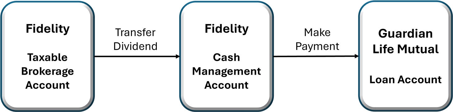 The Guardian Life loan is a loan from the cash value component of a whole-life insurance policy. The interest on the loan is 7.47% APR. We will walk through the loan payment transaction and the loan balance reduction.